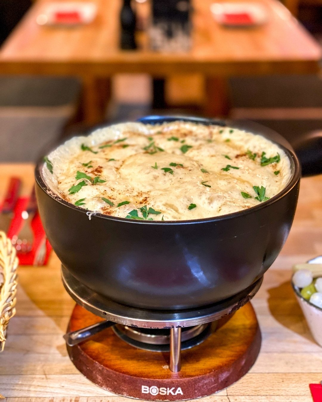 Das Gudrun3 Café in Neuhausen ist so ein Ort, in den man reingeht und sofort denkt: oh wow, wie gemütlich ist das bitte. Seit Juni 2023 gibt es das kleine Café und es hat sich super schnell zum Lieblingsplatz im Viertel entwickelt. Innen wirkt alles wie ein liebevoll eingerichtetes Wohnzimmer, mit roten Samtsofas, warmem Licht und einer Mischung aus alten und neuen Elementen, die total charmant zusammenpassen. Die Atmosphäre ist entspannt, persönlich und einfach richtig heimelig. Man merkt sofort, dass hier Menschen arbeiten, die ihren Job lieben. Kein Wunder also, dass vor allem viele Einheimische kommen, die gutes Essen und eine familiäre Stimmung schätzen. Das Gudrun3 bietet mehrere Käsefondue Varianten auf Vorbestellung an. Das Schweizer Fondue kostet 27 Euro, die mediterrane Version 28 Euro und Gudruns Heart Attack Fondue 32 Euro. Dazu gibt es Beilagen wie Drillinge aus dem Ofen, Charcuterie oder Obst. Das Café ist klein und heiß begehrt, also am besten früh reservieren.