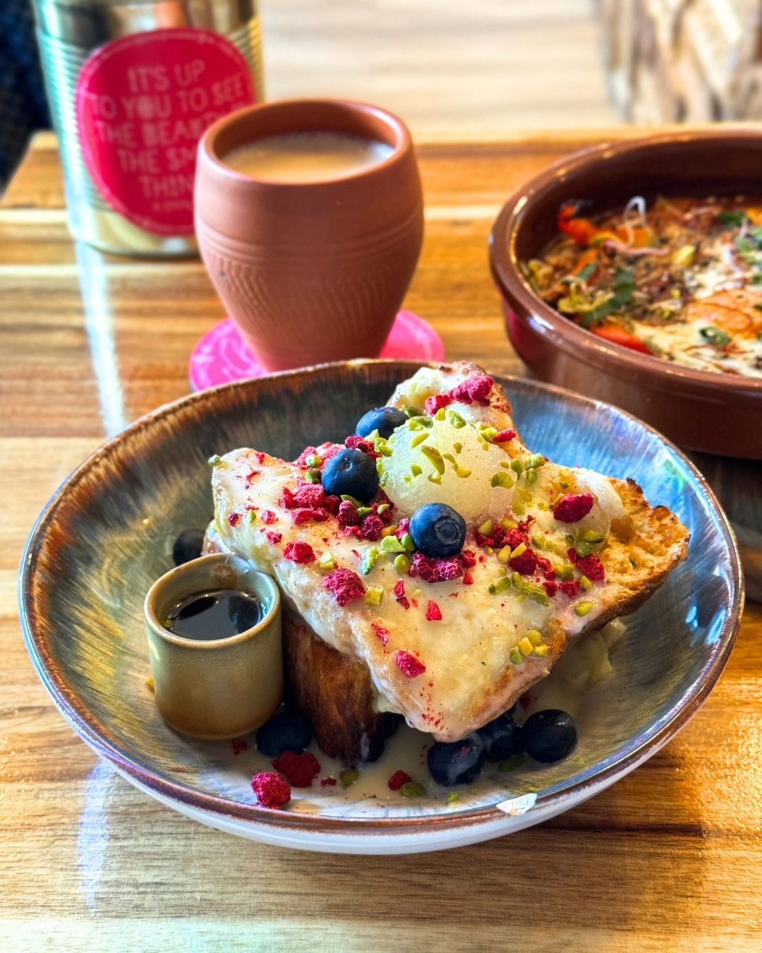 Das Interieur ist bunt und gemütlich, mit türkisfarbenen Wänden, Rattan-Elementen, farbigen Mustern und einem wohnlichen Ambiente. Kulinarisch liegt der Fokus auf vegetarischer Küche mit vielen veganen Optionen. Alle Brunch Gerichte werden mit glutenfreiem Brot der Bäckerei echt jetzt serviert und sind intensiv gewürzt. Auf der Karte stehen Gerichte wie Indian Shakshuka, Samosa Chat, Fancy Fenugreek Potatoes sowie süße Specials wie die Overnight Oats. Meine persönliche Empfehlung ist das indisch inspirierte French Toast mit Kondensmilch, Birne und Käse. Klingt vielleicht ungewohnt, aber ich habe selten so etwas Leckeres gegessen. Besonders beliebt ist ansonsten der Lucky Chai nach Familienrezept, der auch bei vielen als bester Chai in München gilt. Preislich liegen die Brunch Gerichte meist zwischen 12 und 17 Euro, Overnight Oats kosten 8,88 Euro und Kuchen etwa 4,44 Euro. Reservierungen sind leider nicht möglich.