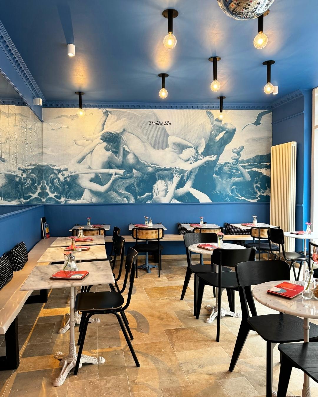 Das Daddee Blu fühlt sich wie ein kleiner Kurzurlaub im Süden an. Das Café im Glockenbach wurde von Hakan Gürbüz und Nicole Stepanovic gegründet und ist genau der richtige Ort für lange Brunch Runden und entspannte Nachmittage. Innen dominiert ein intensives Blau, kombiniert mit warmen Orangetönen, großen Spiegeln, einer Discokugel und einem auffälligen Wandbild mit mediterraner Anmutung. Die Stimmung ist locker und lebendig, das Publikum bunt gemischt und oft gut gelaunt. Für viele Gäste gehören auch die beiden Golden Retriever Pera und Iva fest zum Erlebnis dazu. Entsprechend sind auch andere Hunde herzlich willkommen. Kulinarisch verbindet Daddee Blu mediterrane Küche mit modernen Frühstücksklassikern. Auf der Karte stehen Gerichte wie Turkish Eggs, Menemen, Eggs Benedict, Avocado Brot, Strammer Max oder vegane Optionen wie Eggplant Delight. Süße Pancakes und kreative Kaffee Specials ergänzen das Angebot. Preislich liegen die Frühstücksgerichte meist zwischen 9,50 und 15,50 Euro, Pancakes bei etwa 14,50 Euro und Kaffeespezialitäten zwischen 2,90 und 6,50 Euro.